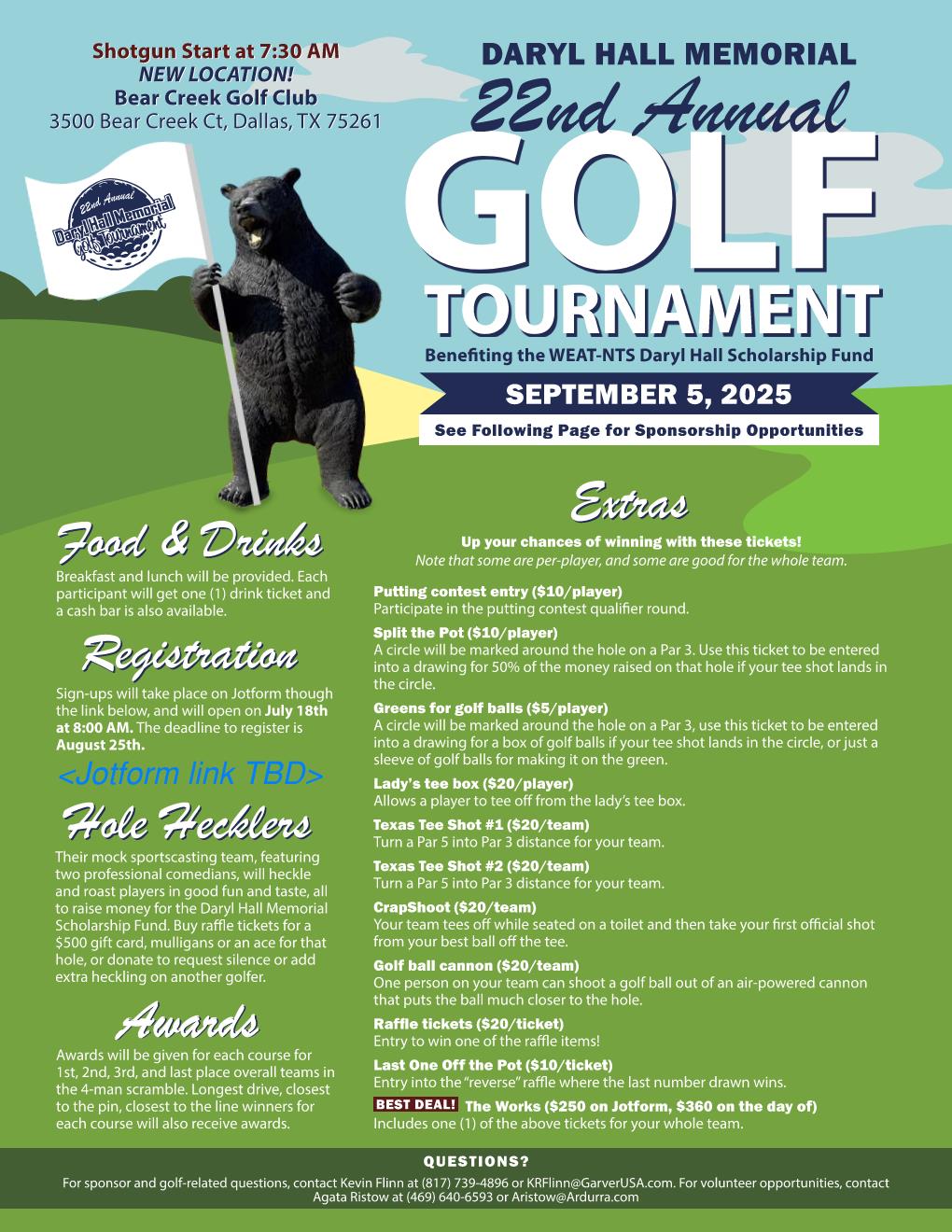 The Daryl Hall Memorial Golf Tournament is an opportunity to continue the legacy of Daryl Hall, a dear friend and member of the North Texas water and wastewater community, by giving back to our industry and helping others who seek higher education. All proceeds from the tournament go directly to the Daryl Hall Scholarship fund. This scholarship is available to all employees of North Texas utilities and their children for the specific purpose of providing technical training and financial assistance associated with continued education. See the Daryl Hall Scholarship and the WEAT-NTS Scholarship pages for more information.